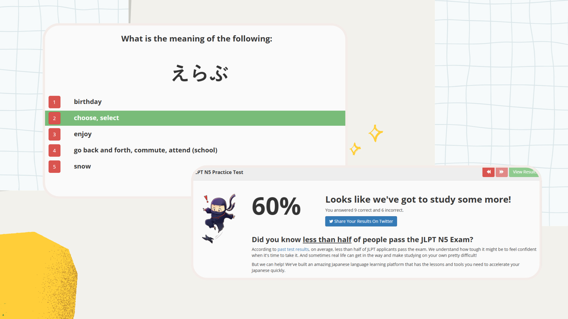 Instead, I switched to an N5 Japanese test and completed it. I scored 60%. I was quite excited to see a vocab word (えらぶ) from my Mikagu deck pop up! I usually fail that card when I’m doing my reviews, but the multiple-choice options helped me remember.