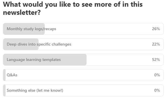 In my last poll, many of you voted that you would like language learning templates. Iāll make sure to work on some this year! You can look forward to more monthly recaps and deep dives into the language challenges I attempt.