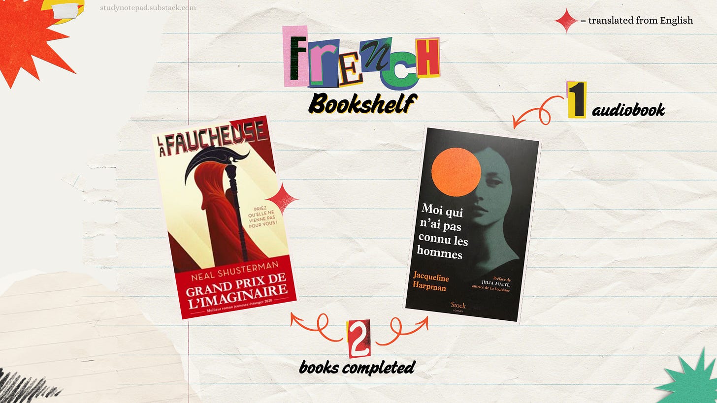 During the month, I finished two books: one audiobook and one ebook. The first was Moi qui nāai pas connu les hommes. I originally listened to it in English last year and later learned it was first written in French. Listening to the original was a nice experience, and at one point, the narrator counted using the Belgian French system, since the author is Belgian. It was a fun detail to notice as I listened!