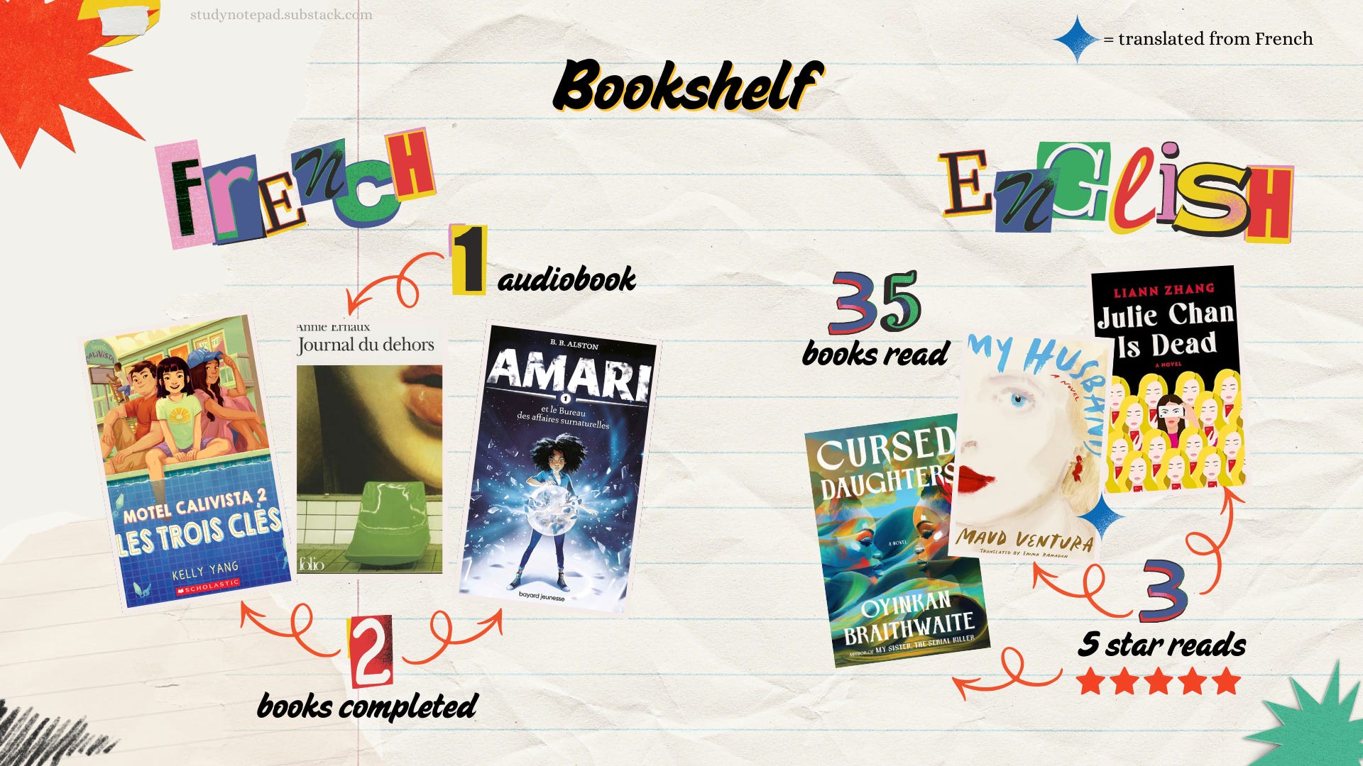 My year involved less traditional studying and more living in my target languages. That mostly looked like watching shows and movies, playing video games, and reading books. And of course, using French at work.