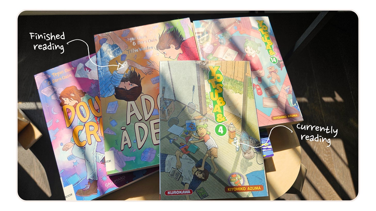 I originally went to return a few books, but since it was a branch I hadnāt been to before, I decided to browse, and of course, I couldnāt leave empty-handed. I picked up Yotsuba&! Vol. 4 and 14. Iāve only read Vol. 1, but Iām assuming itāll be fine to skip around. Iām not too concerned about reading in order. Iāve already finished Ados Ć deux.