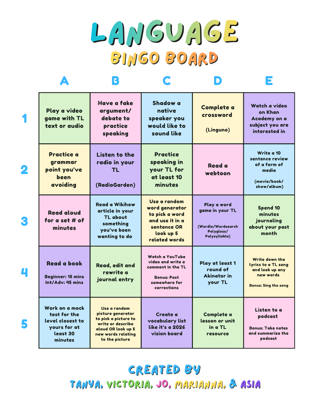 In the month of January, we aimed to complete a language resource. For March, we have decided to create a list of 5 language activities each and compile them into a bingo board for each of us to complete during the month of March.