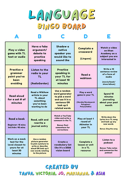Language bingo is the best! I started using them last year and got a few friends into them too. I've already made one for myself for this year, so I won't be using yours this time, but I'll follow along with my own. Good luck with your challenge! I hope you have fun and enjoy your language journey!